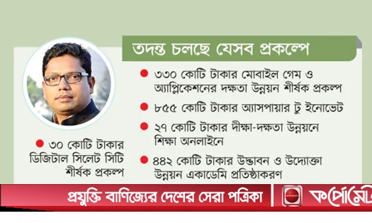 তদন্ত চলছে যেসব প্রকল্পে : ৩৩০ কোটি টাকার মোবাইল গেম ও অ্যাপ্লিকেশনের দক্ষতা উন্নয়ন শীর্ষক প্রকল্প, ৮৫৫ কোটি টাকার অ্যাসপায়ার টু ইনোভেট (এটুআই), ২৭ কোটি টাকার দীক্ষা-দক্ষতা উন্নয়নে শিক্ষা অনলাইনে, ৪৪২ কোটি টাকার উদ্ভাবন ও উদ্যোক্তা উন্নয়ন একাডেমি প্রতিষ্ঠাকরণ (তৃতীয় সংশোধিত), ১৫৮ কোটি টাকার গবেষণা ও উন্নয়নের মাধ্যমে তথ্যপ্রযুক্তিতে বাংলা ভাষা সমৃদ্ধিকরণ (প্রথম সংশোধিত), ৩০ কোটি টাকার ডিজিটাল সিলেট সিটি শীর্ষক প্রকল্প (দ্বিতীয় সংশোধিত), ৫০৪ কোটি টাকার টেলিযোগাযোগ সুবিধাবঞ্চিত এলাকাসমূহে কানেকটিভিটি স্থাপন (কানেকটেড বাংলাদেশ) প্রকল্প, ১৬৭ কোটি টাকার বিজিডি-ই-গভর্নমেন্টের সক্ষমতা বৃদ্ধি শীর্ষক প্রকল্প, ২ হাজার ৫৪১ কোটি টাকার ইনহ্যানচিংডিজিটাল গভর্নমেন্ট অ্যান্ড ইকোনমি (ইডিজিই) শীর্ষক প্রকল্প, ৪৯ কোটি টাকার সরকারের ভিডিও কনফারেন্সিং প্ল্যাটফরম শক্তিশালীকরণ শীর্ষক প্রকল্প, ৮ কোটি টাকার পার্টনারশিপস ফর এ মোর টলারেন্ট, ইনক্লুসিভ বাংলাদেশ (পিটিআইবি)। এ ছাড়া বাংলাদেশ হাই-টেক পার্ক কর্তৃপক্ষের অধীনে ৮৩৭ কোটি টাকার শেখ কামাল আইটি ট্রেনিং অ্যান্ড ইনকিউবেশন সেন্টার (১১টি) প্রকল্প (প্রথম সংশোধিত), ১ হাজার ৮৮৬ কোটি টাকার জেলা পর্যায়ে আইটি/হাই-টেক পার্ক স্থাপন (১২ জেলায়) (প্রথম সংশোধিত), ৫৩৩ কোটি টাকার শেখ কামাল আইটি ট্রেনিং অ্যান্ড ইনকিউবেশন সেন্টার স্থাপন (দ্বিতীয় সংশোধিত) প্রকল্প, ৪৩১ কোটি টাকার বঙ্গবন্ধু হাই-টেক সিটি-২-এর সহায়ক অবকাঠামো নির্মাণ প্রকল্প (দ্বিতীয় সংশোধিত), ৩৫৩ কোটি টাকার ডিজিটাল উদ্যোক্তা এবং উদ্ভাবন ইকো-সিস্টেম উন্নয়ন প্রকল্প, ৭৪ কোটি টাকার বাংলাদেশ-ভারত ডিজিটাল সেবা ও কর্মসংস্থান প্রশিক্ষণ (বিডিসেট) কেন্দ্র প্রতিষ্ঠাকরণ শীর্ষক প্রকল্প, ১ হাজার ৫৩৪ কোটি টাকার শেখ হাসিনা ইনস্টিটিউট অব ফ্রন্টিয়ার টেকনোলজি, ১ হাজার ১১৪ কোটি টাকার শেখ কামাল আইটি ট্রেনিং ও ইনকিউবেশন সেন্টার স্থাপন (১৪টি) প্রকল্প। এ ছাড়া তথ্য ও যোগাযোগ প্রযুক্তি অধিদপ্তর তিনটি প্রকল্পের মধ্যে রয়েছে ৯৩৬ কোটি টাকার শিক্ষাপ্রতিষ্ঠানে ডিজিটাল ল্যাব স্থাপন প্রকল্প (দ্বিতীয় পর্যায়), ৫ হাজার ৯২৩ কোটি টাকার ডিজিটাল সংযোগ স্থাপন (ইডিসি) প্রকল্প ও ২৮৭ কোটি টাকার হার পাওয়ার প্রকল্প : প্রযুক্তির সহায়তায় নারীর ক্ষমতায়ন-দ্বিতীয় পর্যায় প্রকল্প। বিসিসির ছয় প্রকল্পের মধ্যে রয়েছে ২৭১ কোটি টাকার উদ্ভাবন ও উদ্যোক্তা উন্নয়ন একাডেমি প্রতিষ্ঠাকরণ প্রকল্প, ১৫৯ কোটি টাকার গবেষণা ও উন্নয়নের মাধ্যমে তথ্যপ্রযুক্তিতে বাংলা ভাষা সমৃদ্ধিকরণ প্রকল্প, ৫০৪ কোটি টাকার কানেকটেড বাংলাদেশ প্রকল্প, ২ হাজার ১৪১ কোটি টাকার বিজিডি ই-গভ. শার্ট প্রকল্প, ৪৭ কোটি টাকার সরক