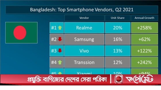বিশ্বের শীর্ষস্থানীয় প্রযুক্তি বাজার বিশ্লেষক প্রতিষ্ঠান ক্যানালিসের সমীক্ষা অনুসারে, ২০২১ সালের ২য় প্রান্তিকে বাংলাদেশের শীর্ষ স্মার্টফোন নির্মাতা প্রতিষ্ঠানে পরিণত হয়েছে রিয়েলমি। পাশাপাশি, তরুণদের পছন্দের স্মার্টফোন ব্র্যান্ড রিয়েলমি সমীক্ষা মতে ২৫৮ শতাংশ বার্ষিক প্রবৃদ্ধি অর্জন করেছে।